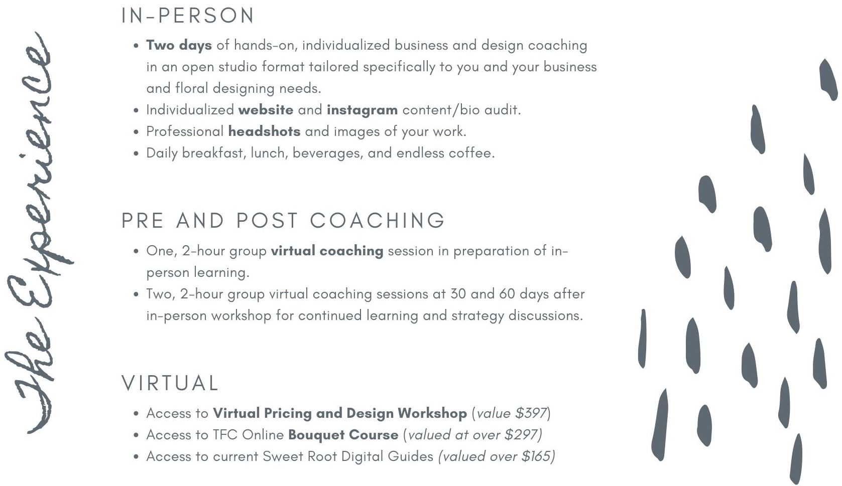 "After being in business for nine years, I knew I wanted to attend a workshop that spoke to the business side of the business as well as the design side. Besides learning invaluable time saving design skills and techniques, I learned how to properly price my services and products, how to hire my weaknesses, and how to organize and streamline my ordering process. There were so many "lightbulb" and "ah-ha!" moments within the two day workshop as well as tuly raw, emotional, and vulnerable moments that served as a sort of thread that wove through and bound the hearts of our group! Not knowing who my classmates would be, I arrived to the workshop excited, eager, and slightly nervous. What I found was a group of twelve incredible people from all walks of life, backgrounds, and skill levels who began the workshop as strangers and ended as friends and design peers. Amy, Lauren, and Rachel each have a gift for teaching and for making each student feel confident, inspired, welcome, and accepted. No question went unanswered, and each optional critique was given with 100% love and intent to make us better designers! This workshop was truly life changing for my business and for my soul!"